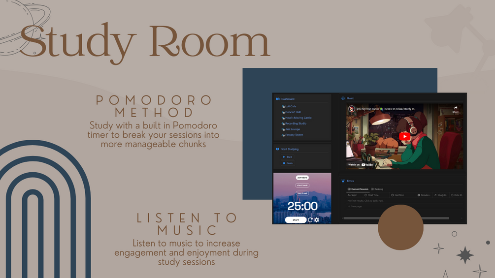 - Music for the Mind: Listen to whatever music puts you in the zone with unique music available in each study environment. Whether you prefer soothing instrumentals, ambient sounds, or energizing beats, our collection has something for everyone.
